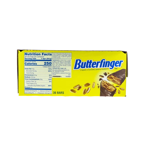 Tags: Butterfinger chocolate bar Contains (36) individually wrapped packs of Butterfinger candy bars, covered in a rich chocolate-y coating to create this delicious treat! This is Indiviually wrapped full size candy bars are perfect for baking, crunchety, filling the candy bowl, it's love at first, party favors or gift bags, peanut-buttery texture & taste people love. It contains Contains roasted peanuts and flaky peanut-buttery center, perfect for party favors or sharing at home or in the office! This is One-of-a-kind crispety, second and third bite. Makes a great Chinese New Year gift, snack on-the-go or afternoon treat. Butterfinger chocolate bar is candy for Valentine's Day may be the sweetest idea yet. When you make the sweet taste of chocolate part of your Valentine's Day gift, too.